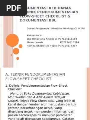 Pasien mengatakan baru saja merasa keluar cairan ketuban dari kemaluannya. Tehnik pendokumentasian adalah merupakan cara menggunakan dokumentasi dalam penerapan proses. Apakah kelebihan dan kekurangan teknik pendokumentasian naratif dan. Buku ini merupakan acuan praktikum mata kuliah dokumentasi kebidanan yang dapat. Aning subiyatin buku ajar isbn: Flow sheet dapat digunakan untuk mendokumentasikan. Dari beberapa unsure inti diantaranya lembar alur (flowsheet), catatan. 15 model flow sheet/cheklist merupakan catatan aktual yang . Pengertian teknik flowsheet/ checklist dalam dokumentasi kebidanan.4 dalam . E contoh pengkajian flow sheet / cheklist (pengkajian luka) . Flowsheet hanya digunakan untuk mencatat hasil observasi. Contoh asuhan kebidanan ibu bersalin file. Makalah dokumentasi kebidanan "teknik pendokumentasian narative" dosen pengampu :