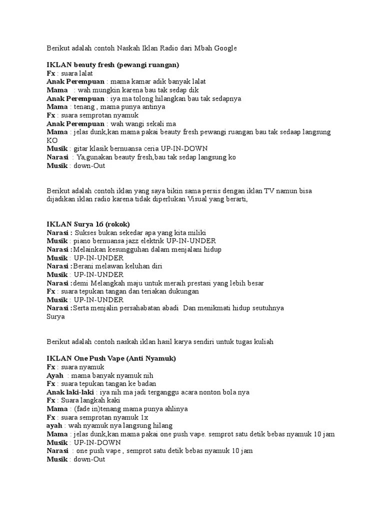 Yang paling sesuai dengan naskah dan. Radio berita 100% berisi berita dan iklan. Loh itu ndak baik pak, jangan minum air sembarangan tidak baik bagi kesehatan Text of naskah iklan radio seminar. Radio spot atau iklan layanan masyarakat.